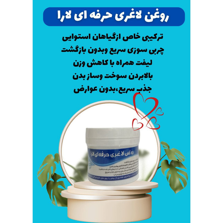 افرادی هستند که فقط در بعضی از قسمتهای بدنشان چربی انباشته شده است. و دوست ندارند کل اندام آنها لاغر شود و نمیتوانند از قرص لاغری برای از بین بردن چربی خود استفاده کنند. به همین دلیل اقدام به کشیدن چربی و تخلیه چربی در مراکز زیبایی میکنند که ممکن است عوارض جبران ناپذیری داشته باشد. شرکت لارا برای رفع این دغدغه و لاغری آسان، روغن لاغری حرفهای را تولید نموده است. این روغن کاملاً گیاهی بوده و بر خلاف محصولات مشابه موجود در بازار هیچ عوارضی برای بدن ندارد. و صد در صد تاثیر گذار است