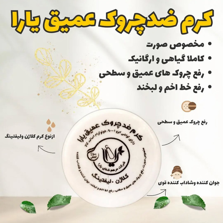 کرم ضد چروک عمیق یارا مخصوص صورت از نوع کرم کلاژن و لیفتینگ کاملا گیاهی و اورگانیک رفع چروک های عمیق و سطحی رفع خط اخم و لبخند جوان کننده و شاداب کننده قوی عالی و پرطرفدار . . ..